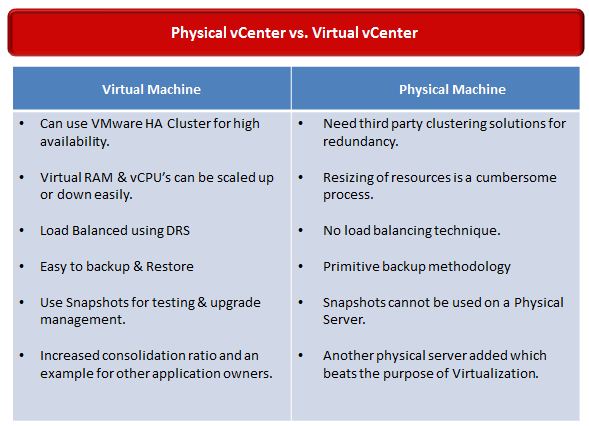vCenter is an important machine and I have written about the importance of Protecting the VMware vCenter Server in one of my articles – Providing Protection & High Availability to a VMware vCenter Server. I would recommend you read this in order to understand the importance of taking the decision of keeping your vCenter Physical or Virtual.