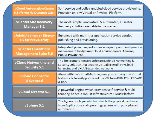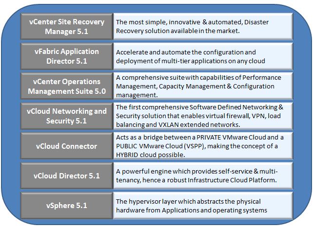 VMware with its innovative products around the Infrastructure, Application and End User layer has been helping the customers with creative solutions to take care of technology and business issues. However, with the birth of vCloud Suite, VMware has just solved the puzzle by bringing together all the pieces and create a complete picture of how a Comprehensive, Multi-Platform, Multi-Cloud Service Provisioning & Management solution should look like.