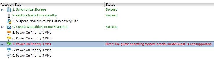 Error: The Guest operating system “oracleLinux64Guest” is not supported. The value in the “quotes” will be the OS which does not support Customization hence if your recovery workflow has the step to customize the IP of this OS, then the recovery plan will STOP with this error. The end state of the Virtual Machine at the DR site would be in registered mode, however it would be in a powered OFF state.