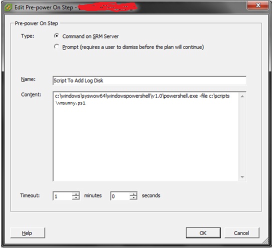 Now we would configure the Recovery Plan for ‘vmsunny’ VM and add a command to call a script from the SRM Server. This script would add the Disk 2 on the VM in the DR site as soon as the Test Recovery or Disaster Recovery option is selected for that recovery plan. This would be a pre-power on script which would add the disk and then the VM would power on.