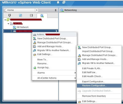 2- Click on Networking -> Right Click on your dvSwitch -> All vCenter Actions -> Restore