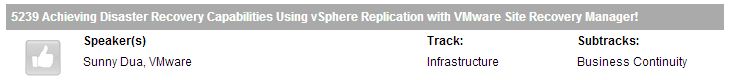Conclusion – The conclusion is a reiteration of the Subject, plus a forward-thinking message you want to leave with the audience, or the overarching key point you want to leave with the audience with regards to your Subject “>Session Outline: This would be a deep dive technical presentation discussing how vSphere Replication works behind the scenes. Then the presentation would talk about integration of vSphere Replication with VMware Site Recovery Manager. The session would conclude with a quick demo, use cases and best practices around using vSphere Replication for Site Recovery Manager.