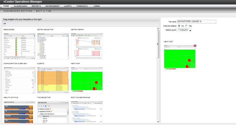 3 – Drag and Drop a Heat-map widget from the left pane to the right pane. (To know more about custom dashboards in vCOps, read this Guide.)