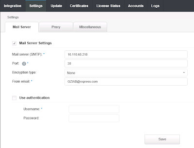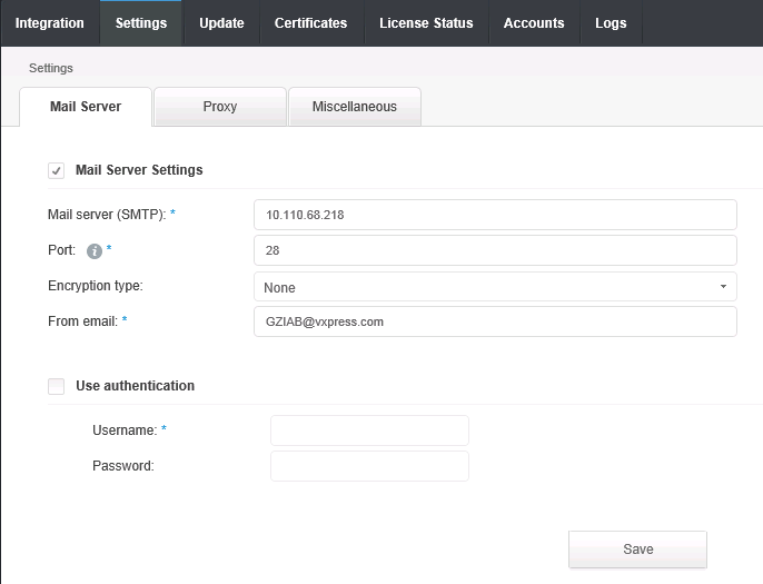 9- Select the Settings tab and configure the Mail Server, Proxy and Time Source under Miscellaneous tab.