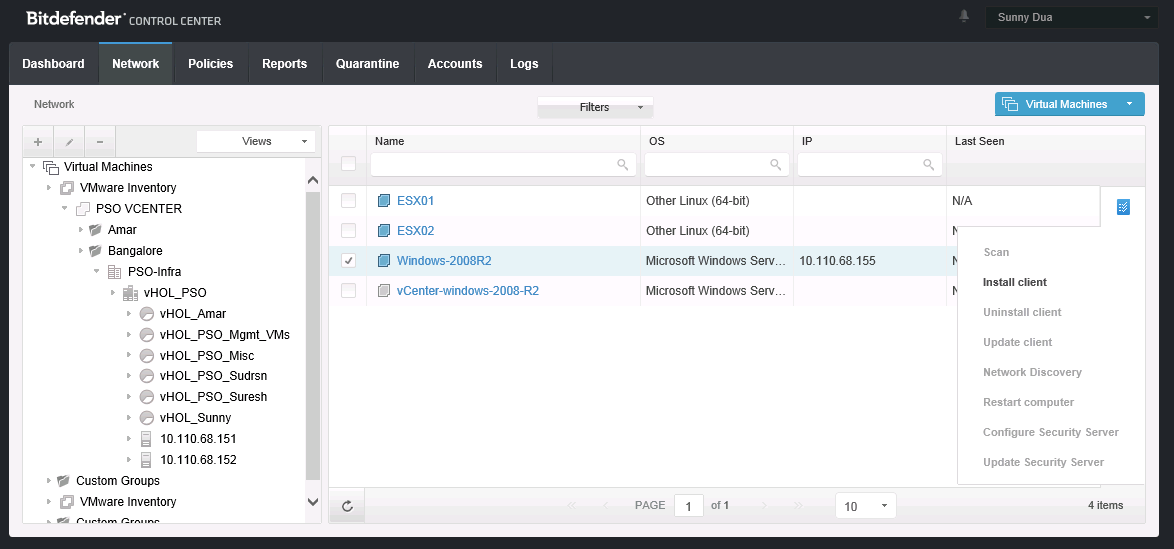 1- Click on Network Tab Select the Resource Pool/Cluster or Datacenter where your workload is located from the left pane. This is similar to the inventory objects in the vCenter. Select the VM where you want to install the Anti-Virus client and click on the Tasks button on the Left top corner and click on Install Client.