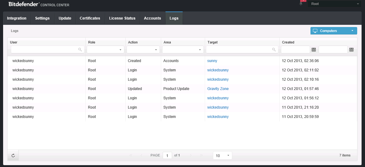 14- And finally the Logs TAB which shows the Audit Logs.