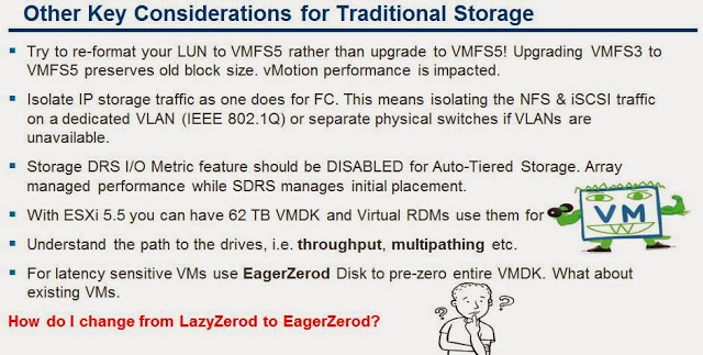 Cormac Hogan, which talks about almost all the possible file system combinations which one can have. My 2 cents on this would be to keep things simple and to use EAGERED ZEROED THICK VMDKs for all your latency sensitive virtual machines. This will save you that extra time which ESXi takes to zero down the blocks before it could write new data in case of LAZY ZEROED THICK VMDKs. You do not have to panic in case you are reading this now and already have your latency sensitive workloads running on Lazy Zeroed Disks. There are a number of ways by which you can convert the existing Lazy Zeroed Disks to Eagered Zero. The slide below shows all the options.
