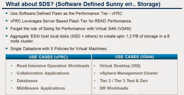 The above slide clearly indicates the 2 basic solutions from VMware in the arena of Software Defined Storage. The first is vFRC (vSphere Flash Read Cache) which allows you to pool cache either from SSD or PCI Cards as the first read device, hence improving read performance for read intensive workloads such as Collaboration Apps, Databases etc. Imagine this as ripping of the cache from your storage array and bringing it close to the ESXi server. This cuts down the travel path and hence improves the performance incredibly.