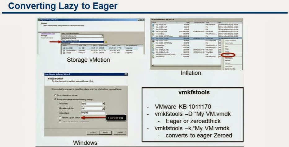 Cormac Hogan, which talks about almost all the possible file system combinations which one can have. My 2 cents on this would be to keep things simple and to use EAGERED ZEROED THICK VMDKs for all your latency sensitive virtual machines. This will save you that extra time which ESXi takes to zero down the blocks before it could write new data in case of LAZY ZEROED THICK VMDKs. You do not have to panic in case you are reading this now and already have your latency sensitive workloads running on Lazy Zeroed Disks. There are a number of ways by which you can convert the existing Lazy Zeroed Disks to Eagered Zero. The slide below shows all the options.