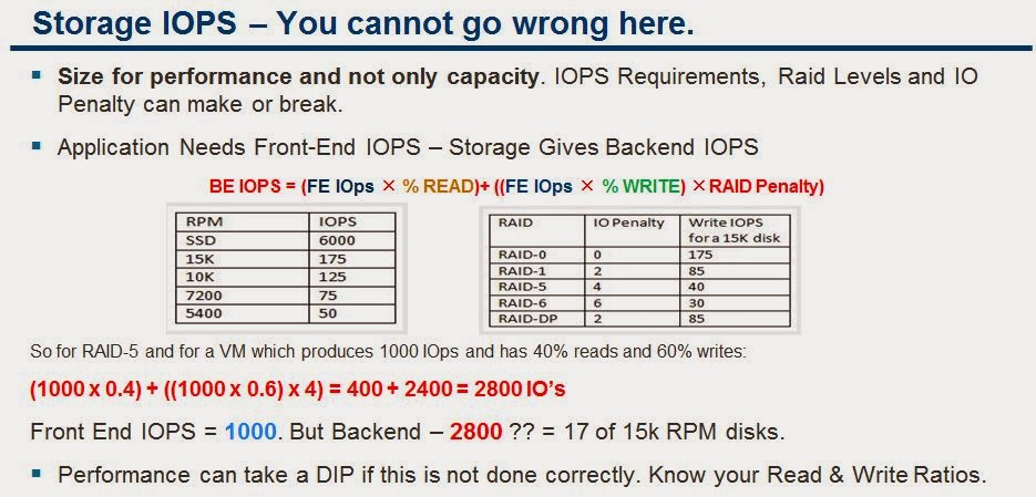 Front End vs. Back End IOPS – This is the most common mistake which is committed while sizing storage. Though your intent might be correct to size the storage on the basis of workload requirements, please remember that workload demands FRONT-END IOPS while Storage Arrays provides BACK-END IOPS. In order to convert Front-end IOPS you need to consider Read/Write ratio of IOPS, the type of disk being used (i.e. SSD, SAS, SATA etc) and finally the RAID Penalty. I have explained this concept with the formula above (Courtesy –
