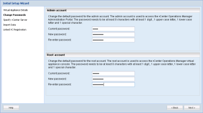5- On the next screen you can reset the admin account and root account password. With vCOps 5.8 onward this password has to be a special password. for e.g. Dashboard@123