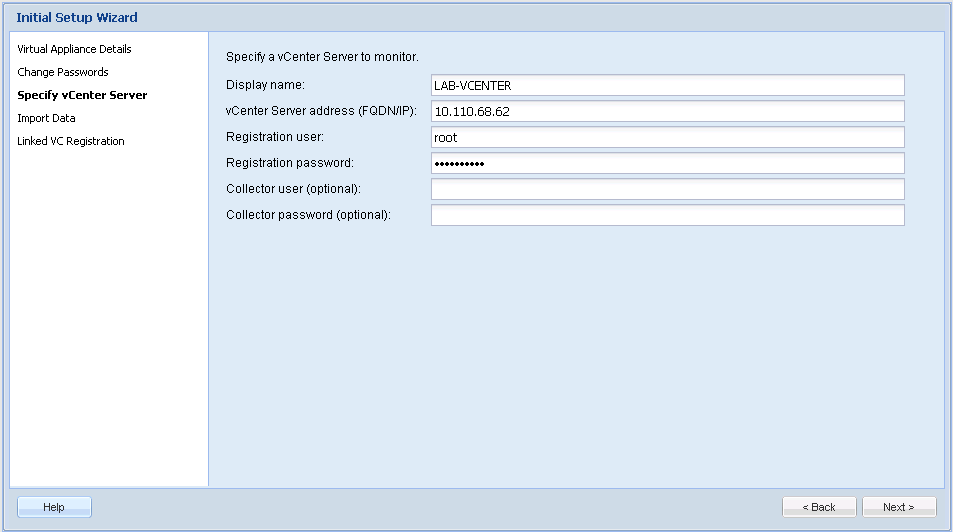 6- Now comes the part where the vCenter which you need to monitor needs to be specified. We will pause here to discuss the Registration User and Collector User.