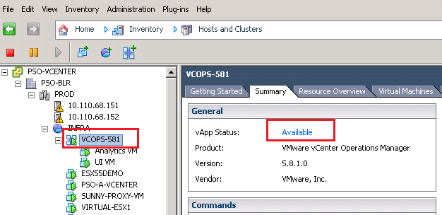 1- Click on the vCOps vAPP in the vCenter and click on the summary tab. Under summary tab click on the hyperlink highlighted below. This will re-direct you to the vCOps admin page.