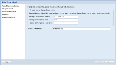 3- Provide the details of the vCenter where the vCOps vAPP has been deployed. This is just to keep a track of vCOps vAPP demographics and is an optional step. Verify the Analytics VM IP address and click on Next.