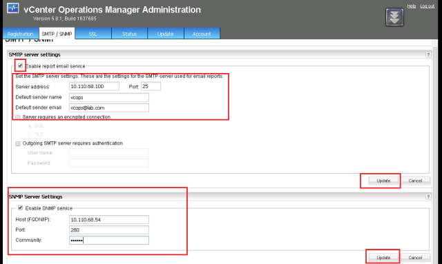 2- Click on the SMTP/SNMP tab to enable the SMTP and SNMP settings and configure the details as shown in the screenshot below. Enabling the SMTP settings are important if you want vCOps to send alerts and reports to desired recipients.