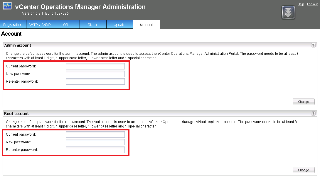 6- The last TAB here is the account tab which can be used to change the admin and root passwords if desired by the vCOps Admin.