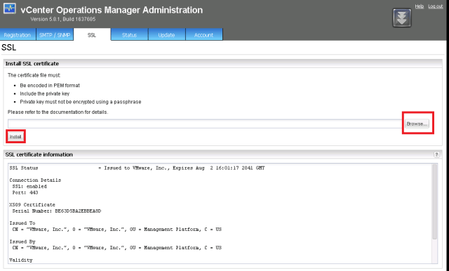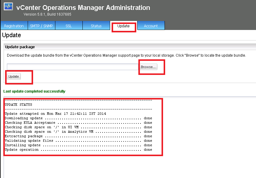 5- The Update Tab is important as it allows you to Add 3rd party adapter and also update the vCOps vAPP from one version to another. These upgrades are done using .pak files which can be browsed for and updated by a click of a button.