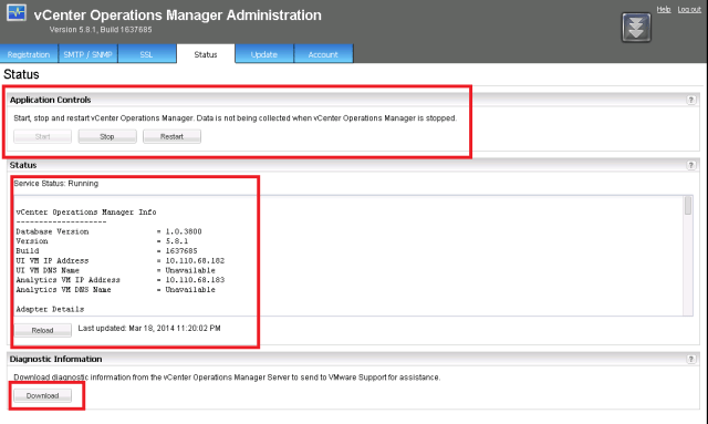 4- Click on the Status tab. Here you can Start/Stop/Restart the vCOps Services. You can check the status of the vCOps service and also download a diagnostic bundle if you wish to do so or if VMware Support asks you to do so.