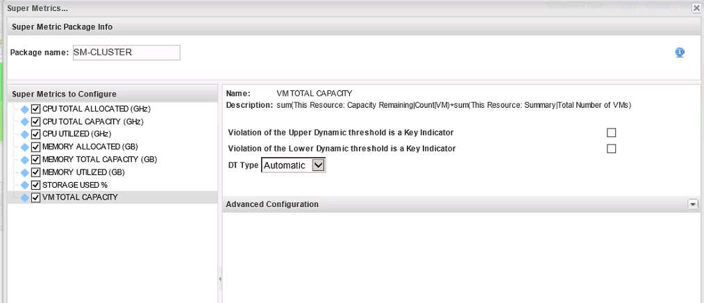 8- Since all these Supermetrics are for Cluster level, give it a name, I call it SM-CLUSTER. Put a check against all the supermetrics you want to add to this package. You can then setup DT configuration if required else just click on OK.