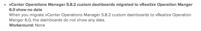 While most of the things mentioned in the list are self-explanatory I would like to highlight that while the custom Dashboards get migrated in the process, it is possible that you not see data in your custom dashboards since the layout of some of the metrics in vROps 6.0 is different from how they were listed in the older version of the product. This is also highlighted in the release notes here.
