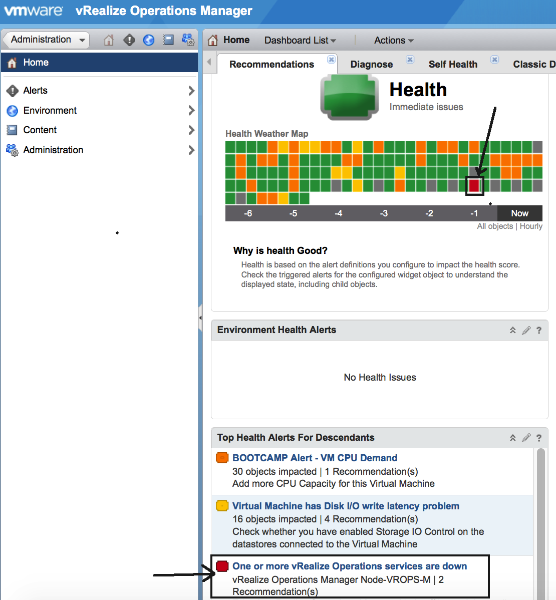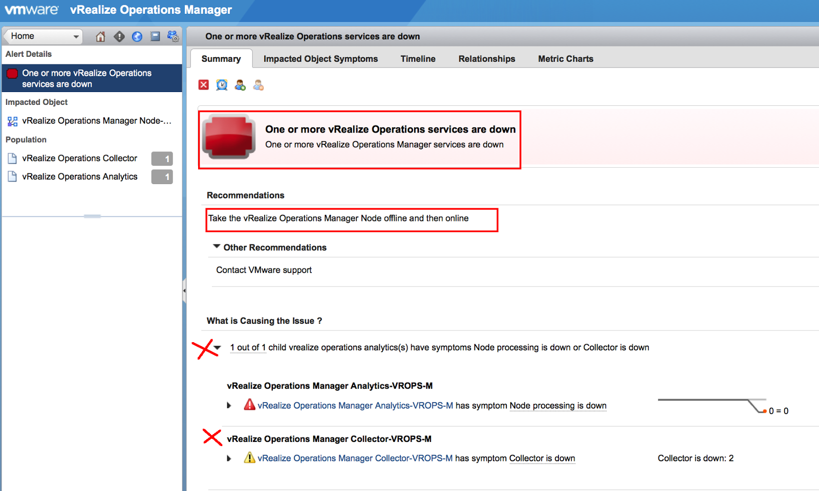 Here, you can see that the Node Processing and Collector services are down and hence we are getting 2 recommendations to resolve this issue. One is to take the node offline and then bring it back online. The other option is to visit VMware Support. We could have also reached this screen, or could have directly jumped on a screen which monitors the entire vROps cluster by clicking on: