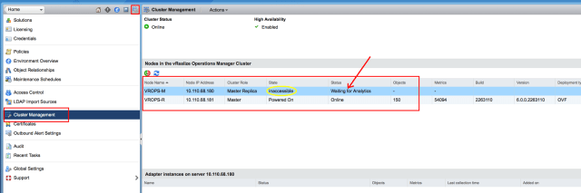 As soon as I tried to take the host offline, I got an error that the Operation has failed and I should contact VMware support. Since, it’s just a lab I will go ahead and restart the VROPS-M node from the vCenter Server and after a few minutes I was able to login to the Master Node IP address. Once I login into the Product UI, I can see that the resources have been distributed between both the clusters and the data gathering has started to work again. One thing to notice is that, after a failure the Master and Replica have switched over roles.