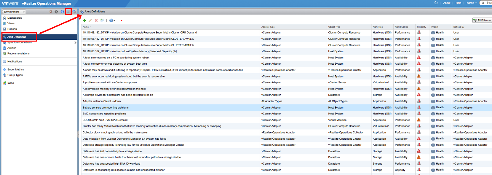 While the screenshot above is from the recommendations dashboard, you would need to change the alert definitions if you wish you impact these badges by various alerts which are defined by the system or are user defined. To do so, you need to go into Content -> Alert Definitions as per the screenshot below:
