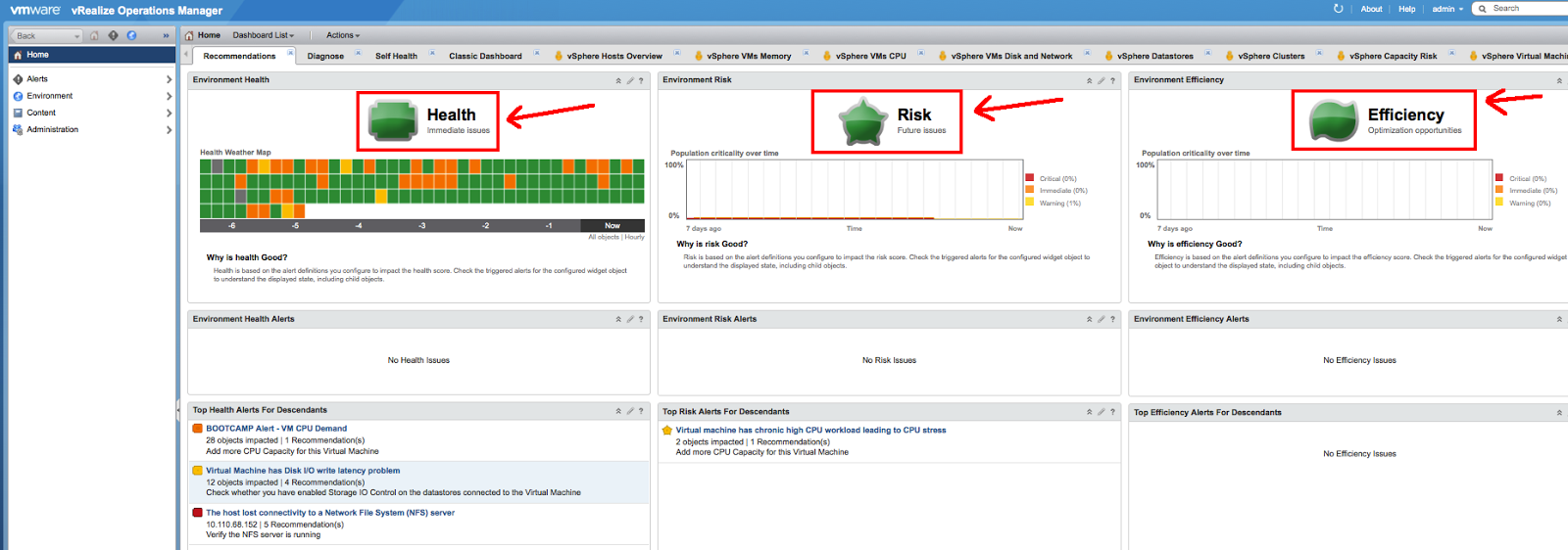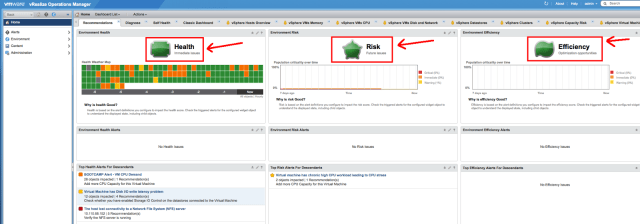 I remember that someone told me that the badge scores were good and they should have remained with vROps 6.0. In my humble opinion badge scores are still there but they are gone from the default dashboard which is called the “Recommendations” Dashboard. The function of this dashboard is to provide you some action items based on the metrics which are changing in your environment and the best way to provide these recommendations would be in the form of the alerts which at the end of the day help you monitor your key performance indicators. Was that not the reason why you invested in a solution like this???