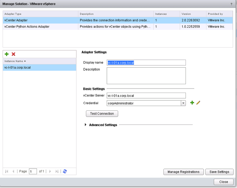 Select vCenter Adapter and remove the vCenter adapter instance. In this case vc-l- 01a.corp.local. Also remove the vCenter Python Actions Adapter. Then Save Settings and Close.