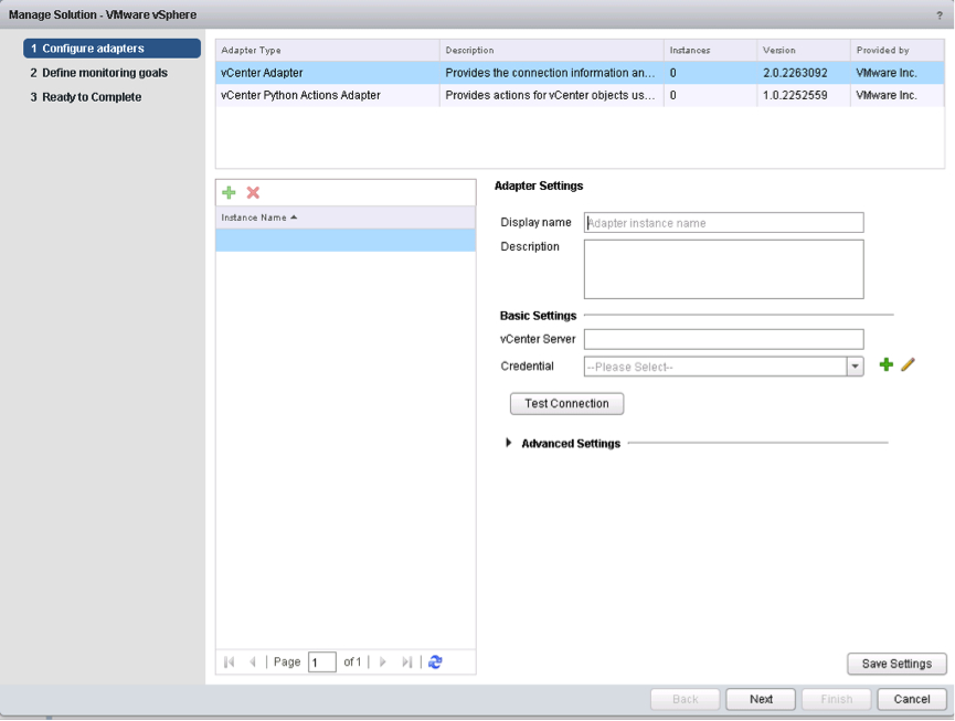 You will now get to the Config-Wizard. Enter the settings for the vCenter Instance accordingly, select credentials and Click Save Settings. Answer pop-ups for certificates (OK) and already registered vCenters (Yes). Then add the vCenter Python Actions Adapter (if desired). Click Save Settings. Important: Click Next