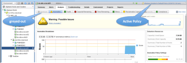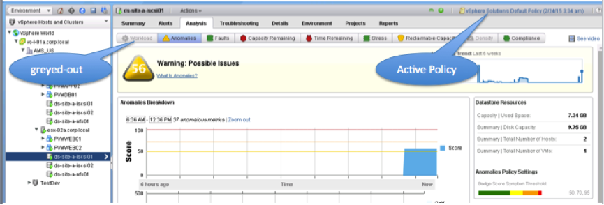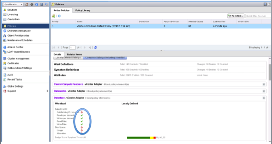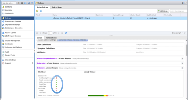 Configuration Policies are delivered when vR Ops is installed and when additional Solutions (Management Packs) are installed. They define, which metrics are influencing the Capacity Management, Reports and Alerts. Policies follow an “inheritance model”.
