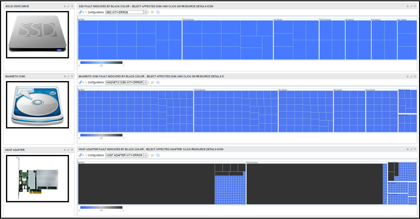 - The first row is SSD Monitoring, where you can see a heatmap indicating the errors on a SSD in 7 different VSAN Clusters. If a SSD has an error the color & size of the column representing that SSD would turn black in color. You can select the faulty object and then click on the Resource Details icon to know more about the SSD Error and see if it requires a replacement by looking into the Recommendations from vROps.