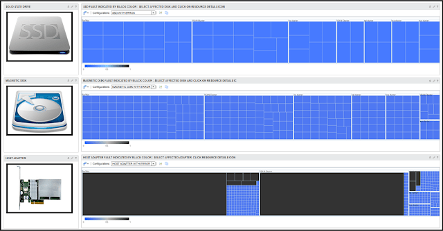 - The second row is for monitoring the magnetic disks. This is built with the same logic like the previous row of SSD. A black color box means a problematic disk.