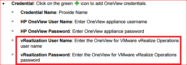 It is not clear as to what this username and password should be. First of all the author spelled vRealize incorrectly and then there is no mention of what is the OneView for vROps Username anywhere in the document. I tried using the same account which I have configured on OneView for vROps integration and tried to Test the Connection.