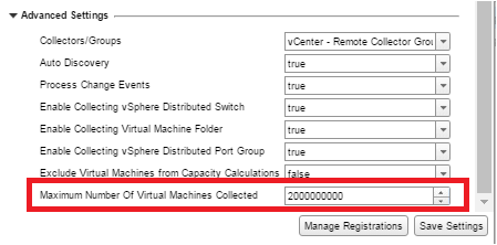 Please Note: It is recommended that you DO NOT disable VM Object collection without understanding the full impact of this change. While this will give you scalability, it will not bring VM Data which might be used for calculating metrics at Host or Cluster level. Please use this only for specific uses cases and preferably in a development environment to understand the full impact, before rolling out in production.