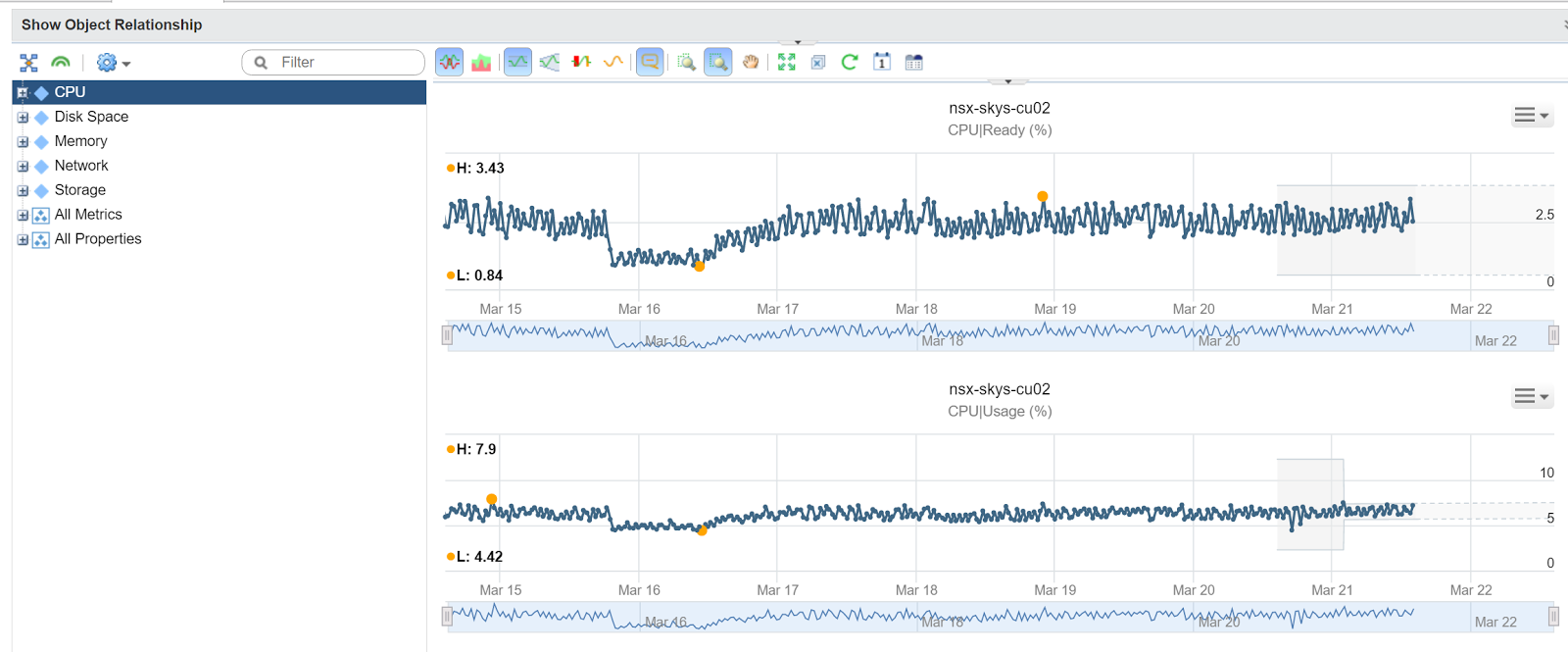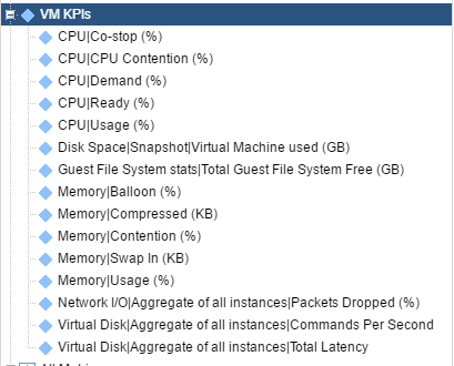 You can see that apart from all metrics and all properties for the virtual machine, you can see 5 custom categories which list specific metrics which can be used for troubleshooting. As soon as I double click on CPU, I will see all the key metrics pertaining to the CPU Metric group in one shot on the right pane: