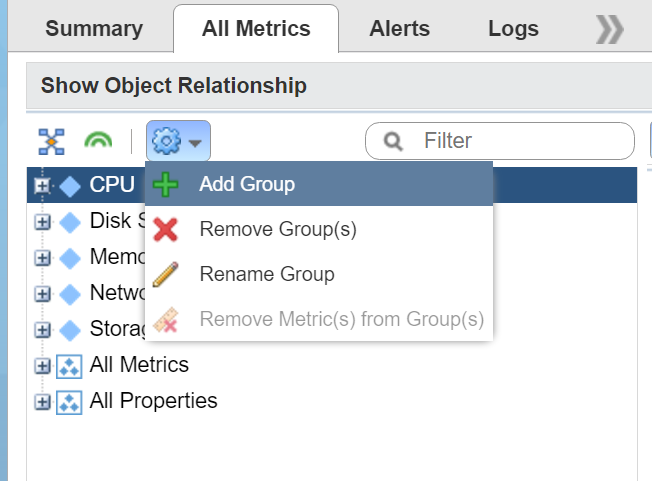 arrival of vROps 6.5, this feature is now available and now you can create your own custom metric groups with the metrics you like to use for troubleshooting.