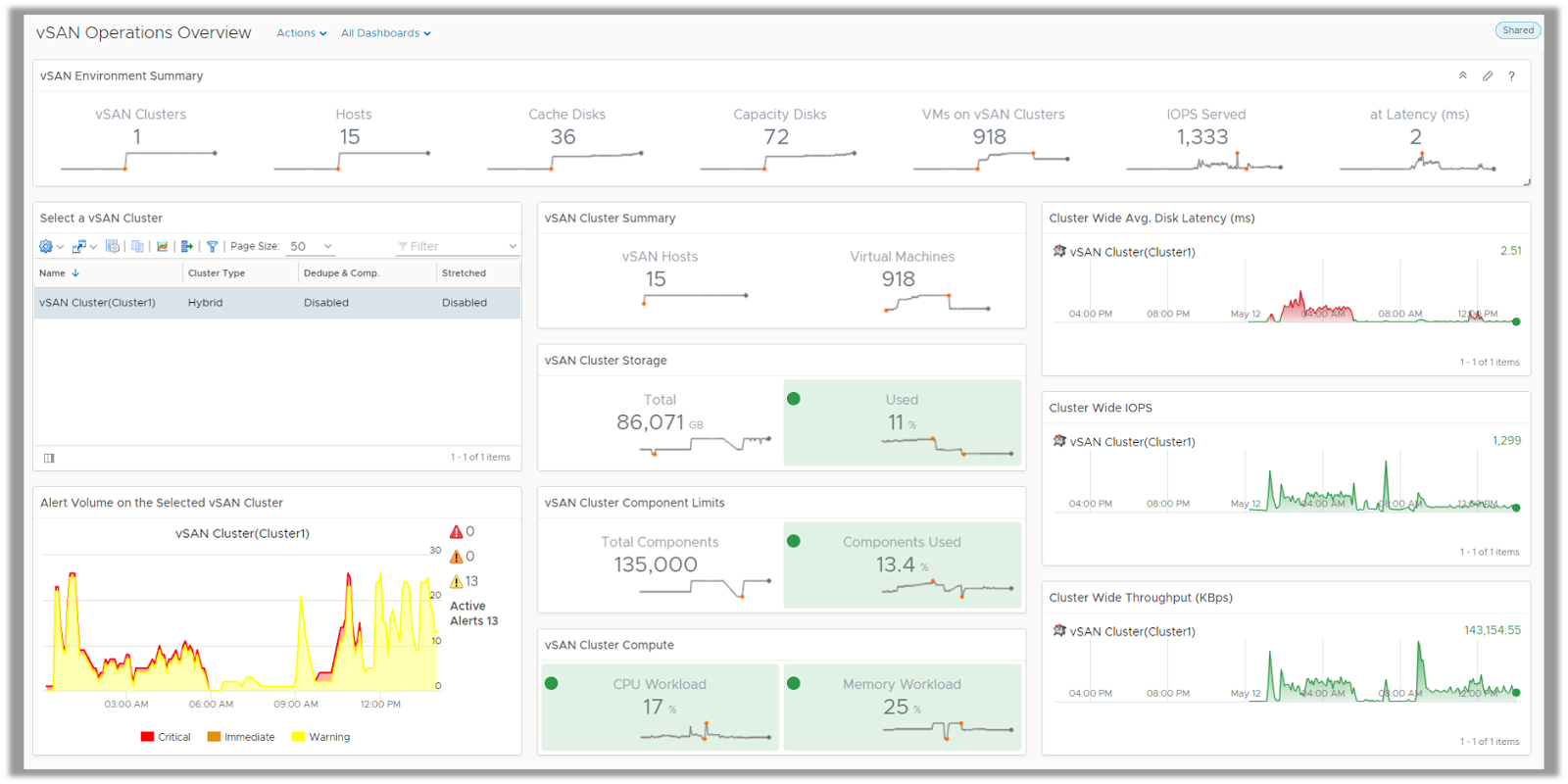 The goal of this dashboard is to help understand the utilization and performance patterns for each of your vSAN clusters by simply selecting one from the provided list. VSAN properties such as Hybrid or All Flash, Dedupe & Compression or a Stretched vSAN cluster can be easily tracked through this dashboard.