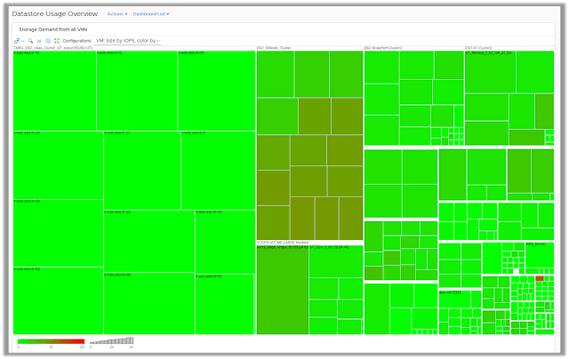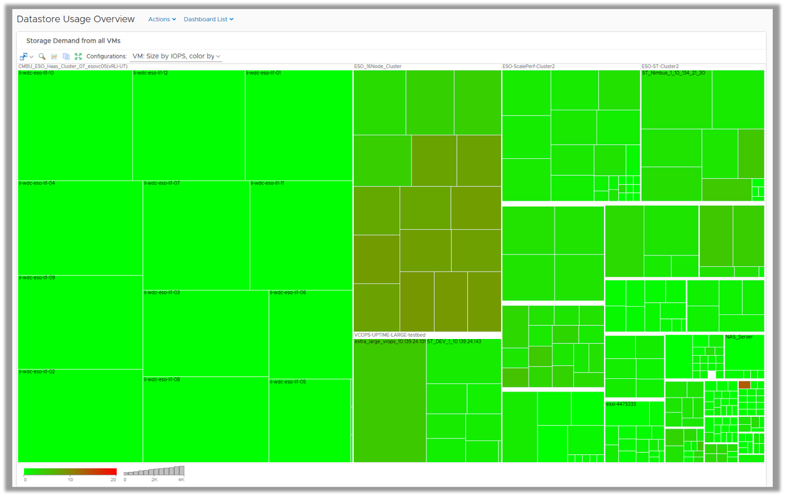 The Datastore Usage Dashboard is suitable for a NOC environment. The dashboard provides a quick glimpse of all the virtual machines in your environment using a heatmap. Each virtual machine is represented by a box on the heatmap. Using this dashboard, a NOC administrator can quickly identify virtual machines which are generating high IOPS since the boxes representing the virtual machine are sized by the number of IOPS they are generating.