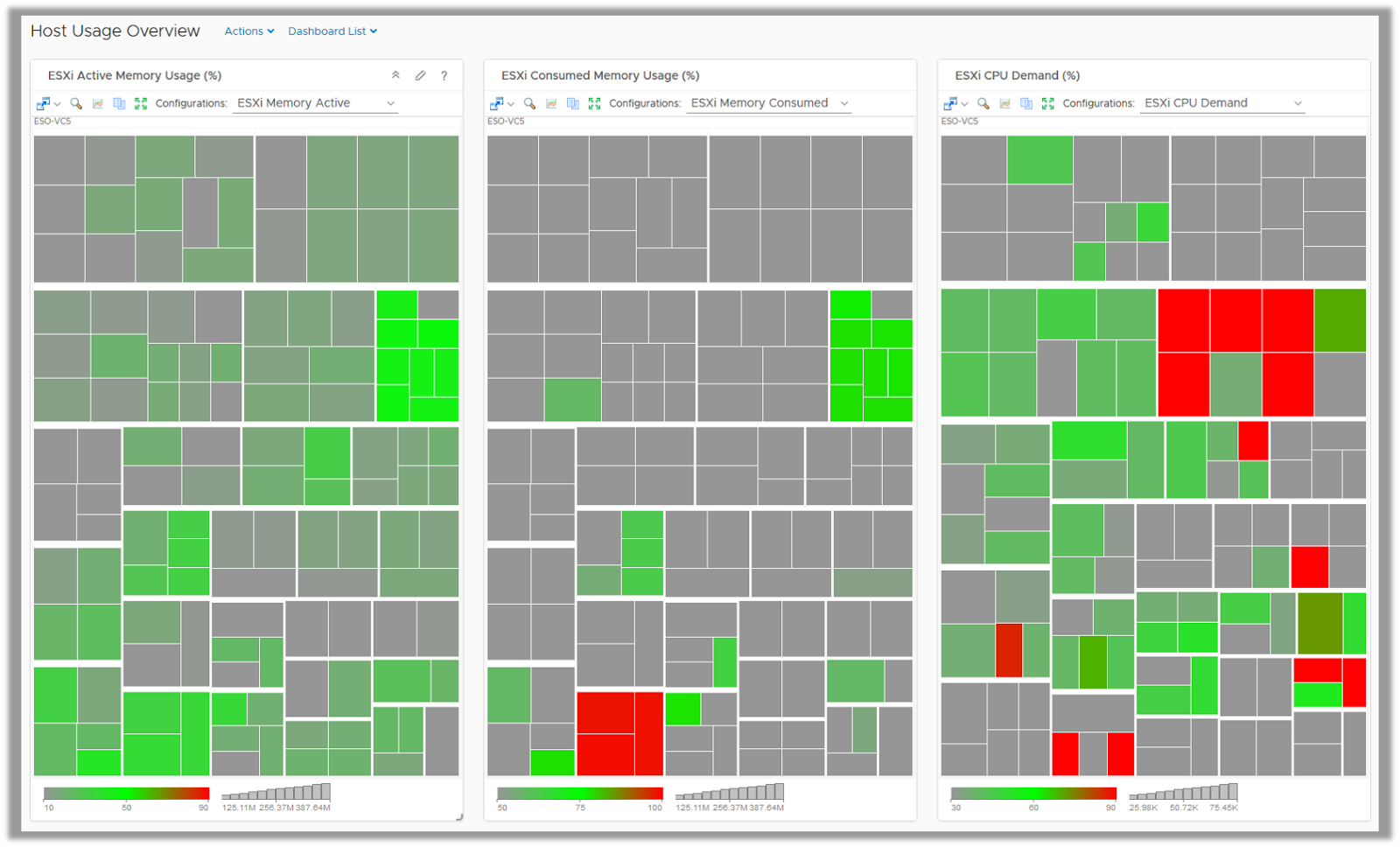 The Host Usage Dashboard is suitable for a NOC environment. The dashboard provides a quick glimpse of all the ESXi hosts in your environment using a heatmap. Using this dashboard the NOC administrator can easily find resource bottlenecks in your environment created due to high Memory Demand, Memory Consumption or CPU Demand.