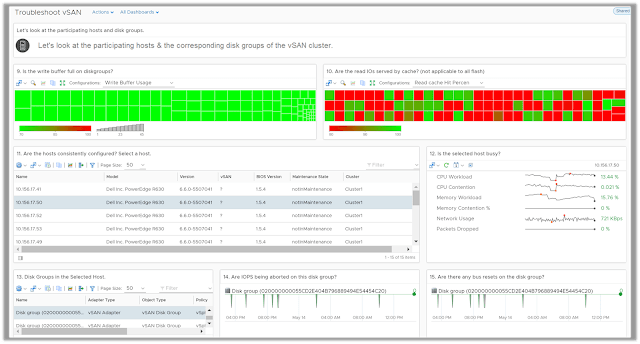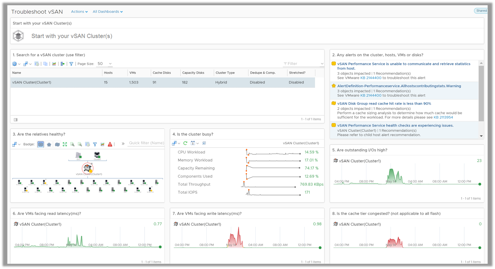 The Troubleshoot vSAN dashboard is designed to help a vSAN administrator step through a guided workflow to investigate potential issues with each layer of vSAN. The dashboard allows you to start with looking at key properties of your vSAN cluster along with the active alerts on any of the cluster components such as hosts, disk groups or the vSAN datastores.
