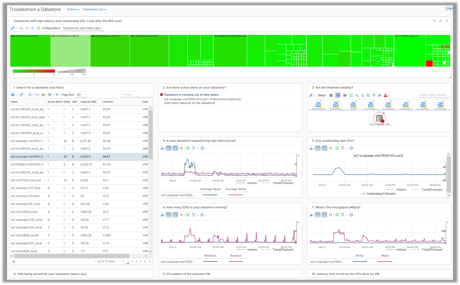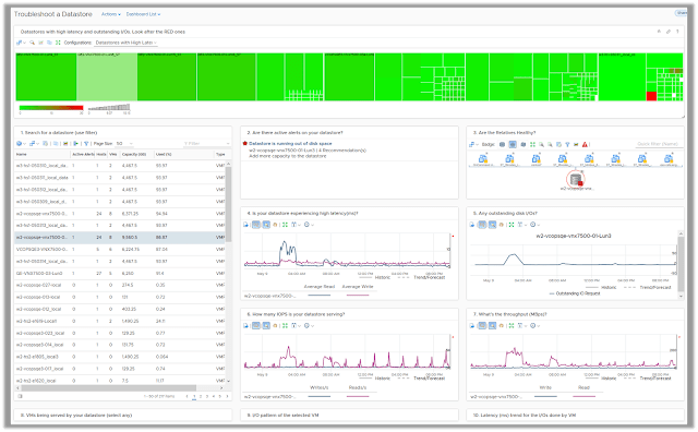 Troubleshoot a Datastore dashboard helps provide a guided workload to an administrator in order to quickly identify storage issues and act on them. Based on your troubleshooting style you can either start with a Datastore which might be in trouble due to high latency and is showing red on the heatmap or you can search for a Datastore which you have in mind. You can also sort all the datastores with active alerts and start working your way with a Datastore with known problems.