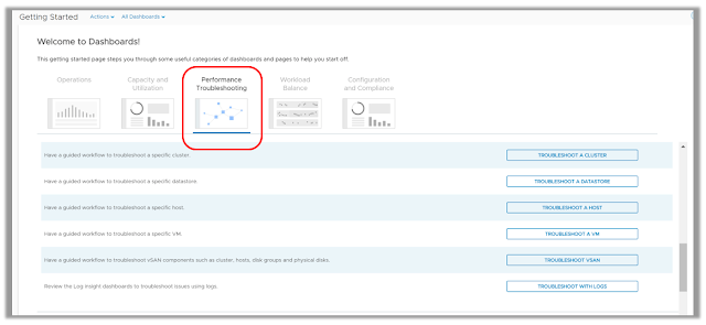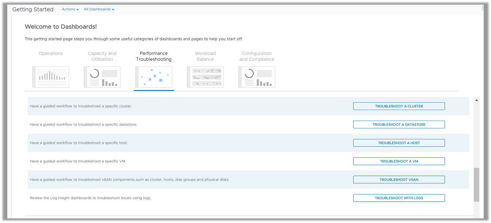 The Performance Troubleshooting category caters to the administrators responsible for managing the performance & availability of the virtual machines running in the virtual infrastructure. This category runs your through a guided workflow to answer questions which will help you with the troubleshooting process. The dashboards in this category identify and isolate problems that may impact your applications. They provide a line of sight into the full stack to isolate and identify the root cause quickly.