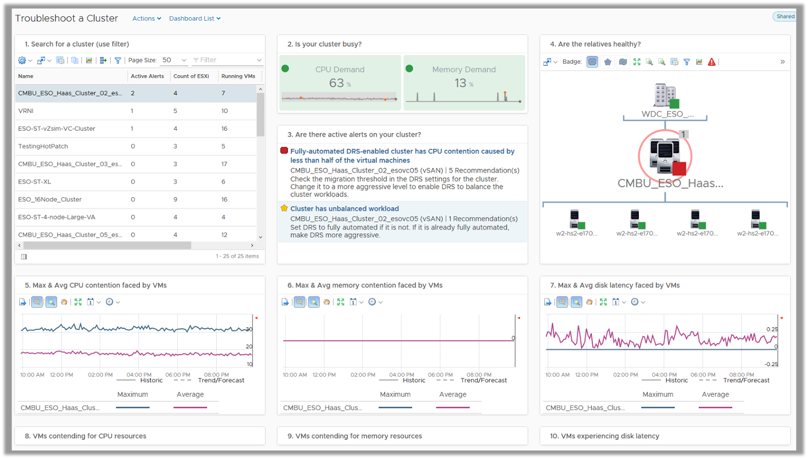 You can easily view the hierarchy of objects related to the cluster and review their status to identify if they are impacted due to the current health of the cluster. You can quickly identify any contention issues by looking at the max and avg. contention faced by the virtual machines on the selected cluster. The dashboard allows you to drill down to specific virtual machines which might be a victim of resource contention and take your next steps in the troubleshooting process to cater to those victims and avoid issues proactively.