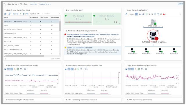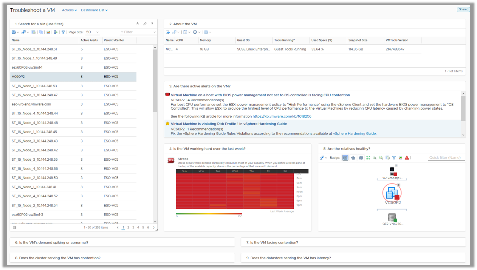 The Troubleshoot a VM dashboard helps a VI Administrator to deal with day to day troubleshooting of issues in a virtual infrastructure. While most of the IT issues in an organization are reported at the application layer, this dashboard provides a guided workflow which can help investigate an ongoing or a suspected issue with virtual machines supporting the impacted applications.