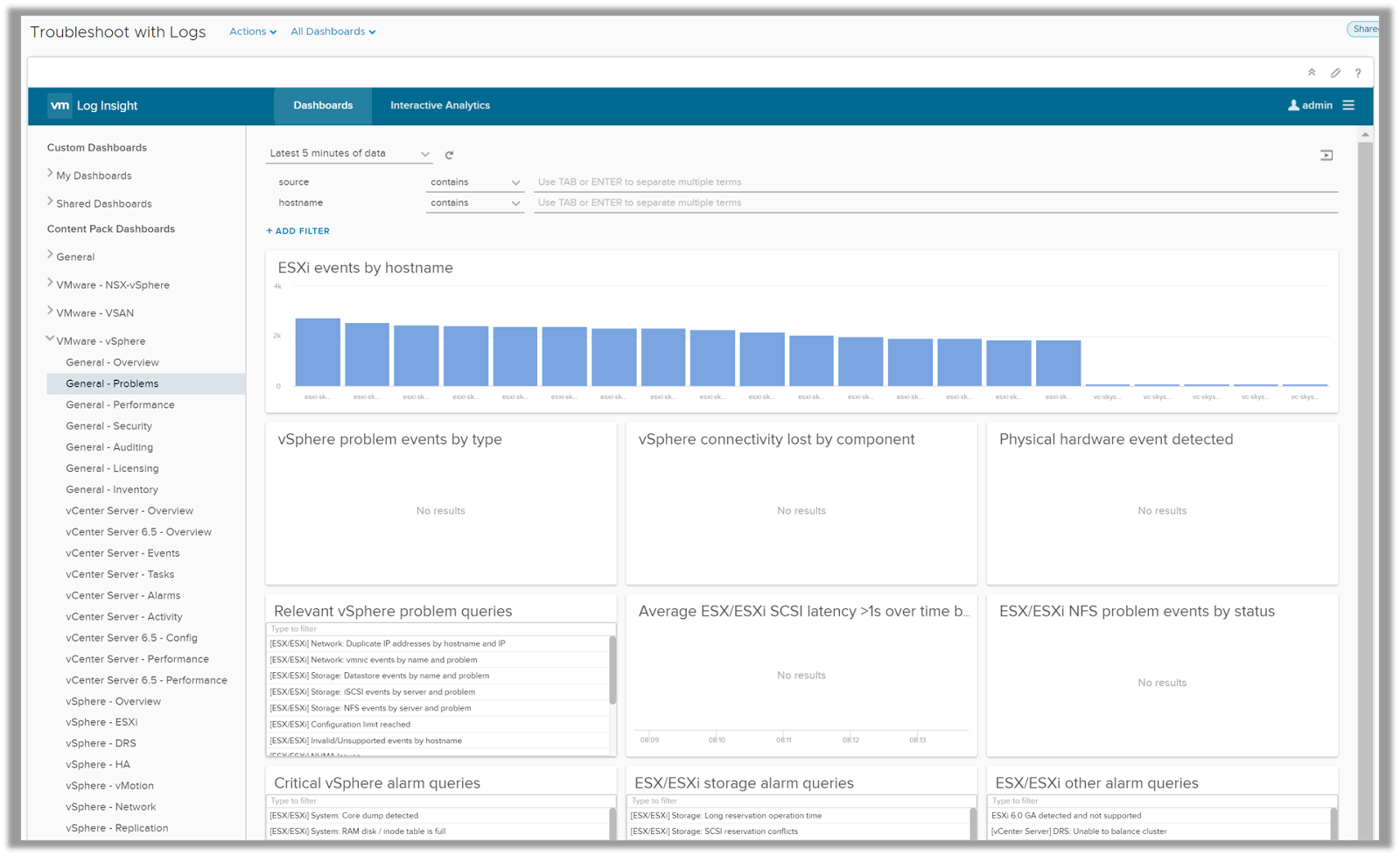 The Troubleshoot with Logs dashboard can be used when you want to investigate an ongoing issue within your virtual infrastructure using the logs. This dashboard helps you to look at predefined views created within Log Insight to answer common questions which can be surfaced through pre-defined queries within Log insight.