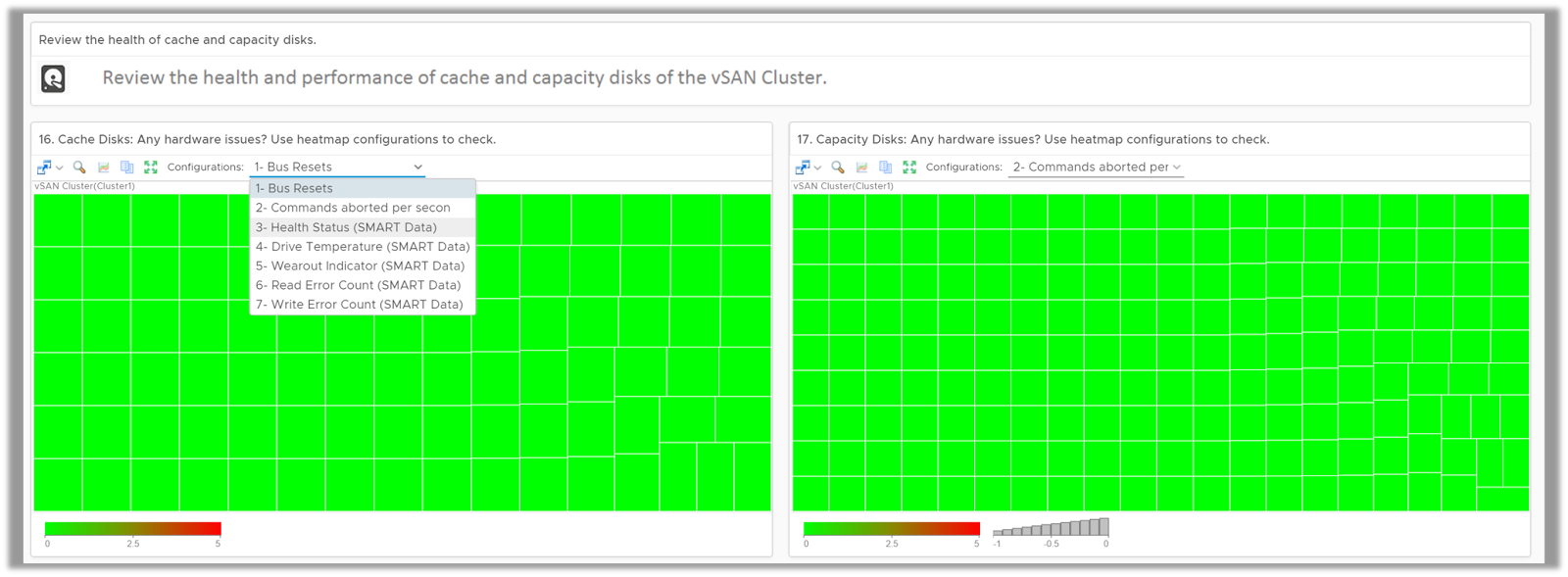 Heatmaps within the dashboard help you answer questions around write buffer usage, cache hit ratio, host configurations and physical issues with capacity and cache disks such as drive wearout, drive temperature and read-write errors.
