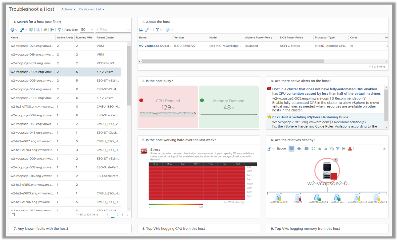 As soon as you select a host, you can see the key properties of each of the host to ensure thy are configured as per your virtual infrastructure design. Any deviation from standards could cause potential issues. You can answer some key questions around current and past utilization, workload trends over the last week and if virtual machines served by the host are healthy.