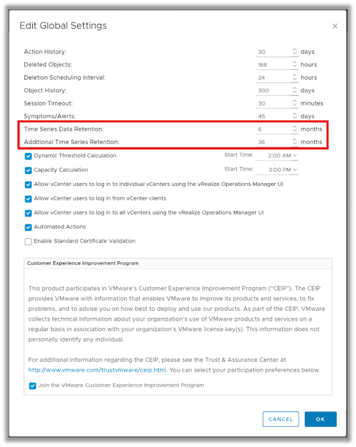 Additional Time Series Retention : This is a NEW setting with vROps 6.6. This is set to 36 months by default. This setting will ensure that after 6 months of normal retention (5 minutes), the 7th month data is rolled up into a ONE HOUR (1 Hour) roll up. You can set up this option upto 120 months for data roll ups.