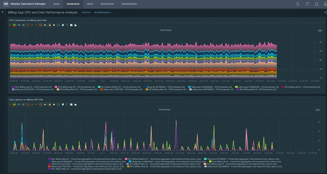 Let’s look at an example. We will use a Billing App dashboard which I have created to monitor the CPU Contention and Disk Latency on all the virtual machines which make up the billing application in my organization.